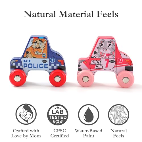 BEKILOLE 4 Wooden Race Cars Montessori Learning Toys for 6-12-18 Months Birthday Gift Travel Toy for 1 2 Year Old Boy Girl Infant Toddlers 8 9 10 Months Old with Tracing Flash Cards